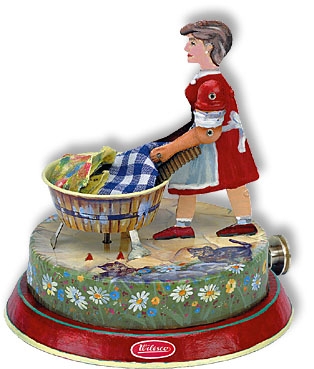 Diese tüchtige Waschfrau ergänzt die Wilesco Blechspiel- warenserie. Auf einer runden und bunt bedruckten Grundplatte verrichtet die Waschfrau die damalige Schwerstarbeit mit Leichtigkeit.