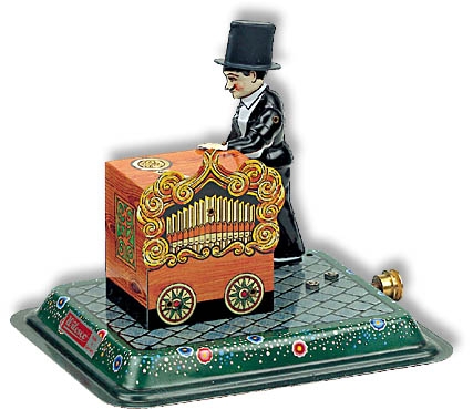 Nostalgischer Drehorgelspieler, mit Melodie. Aus lackiertem und bedrucktem Blech.