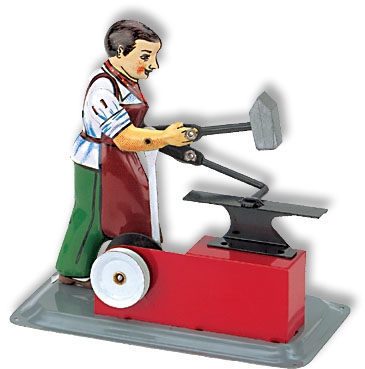 Ein Schmied mit Hammer am Amboss. Aus lackiertem und bedrucktem Blech.