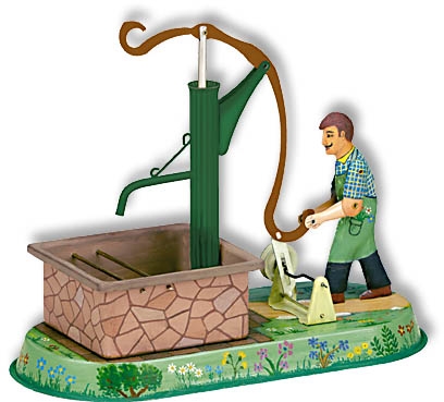 Ein Gärtner am Dorfbrunnen. Pumpe voll funktionsfähig. Aus lackiertem und bedrucktem Blech.