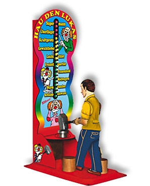 Das neue Antriebsmodell stellt auch hier die Verbindung der Mechanik und Elektronik her. Bei diesem originalgetreuen Modell wird durch den Schlag ein Impuls an die farbigen Leuchtdioden weitergegeben. Mit jedem Schlag beginnt der Farbbalken neu in die Höhe zu schnellen. Die Elektronik wird durch zwei Batterien mit Spannung versorgt. Mit diesem Modell wird die Wilesco-Jahrmarktserie durch einen Blickfang erweitert.