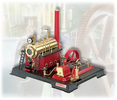Messingkessel hochglanzpoliert, Durchmesser 65 mm, Länge 165 mm, Kesselinhalt 500 cm³, mit als Schauglas ausgebildetem Wasserstandsanzeiger, Wasserablassventil. Kesselhaus mit Ziegelsteinmuster, zwei Laufstege mit Galeriestange und zwei Leitern. Doppelt wirkender, feststehender Messingzylinder mit einem in beide Drehrichtungen anwerfbaren Schwungrad, Dampfpfeife mit Kettenzug, Dampfabsperr-Handradventil, Schwungrad 100 mm Durchmesser mit Antriebsscheibe und massivem, formschönen Druckgussgestänge, Zentrifugalregulator, Dampfstrahlöler und Galeriestange. Kleinmanometer kombiniert mit Federsicherheitsventil. Das Kondensat wird in einen Behälter verdeckt hinter dem Kesselhaus abgeleitet. Dadurch raucht der Kamin naturgetreu. Die Speisewasserpumpe erlaubt während des Betriebes ein Befüllen des Kessels.