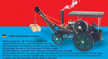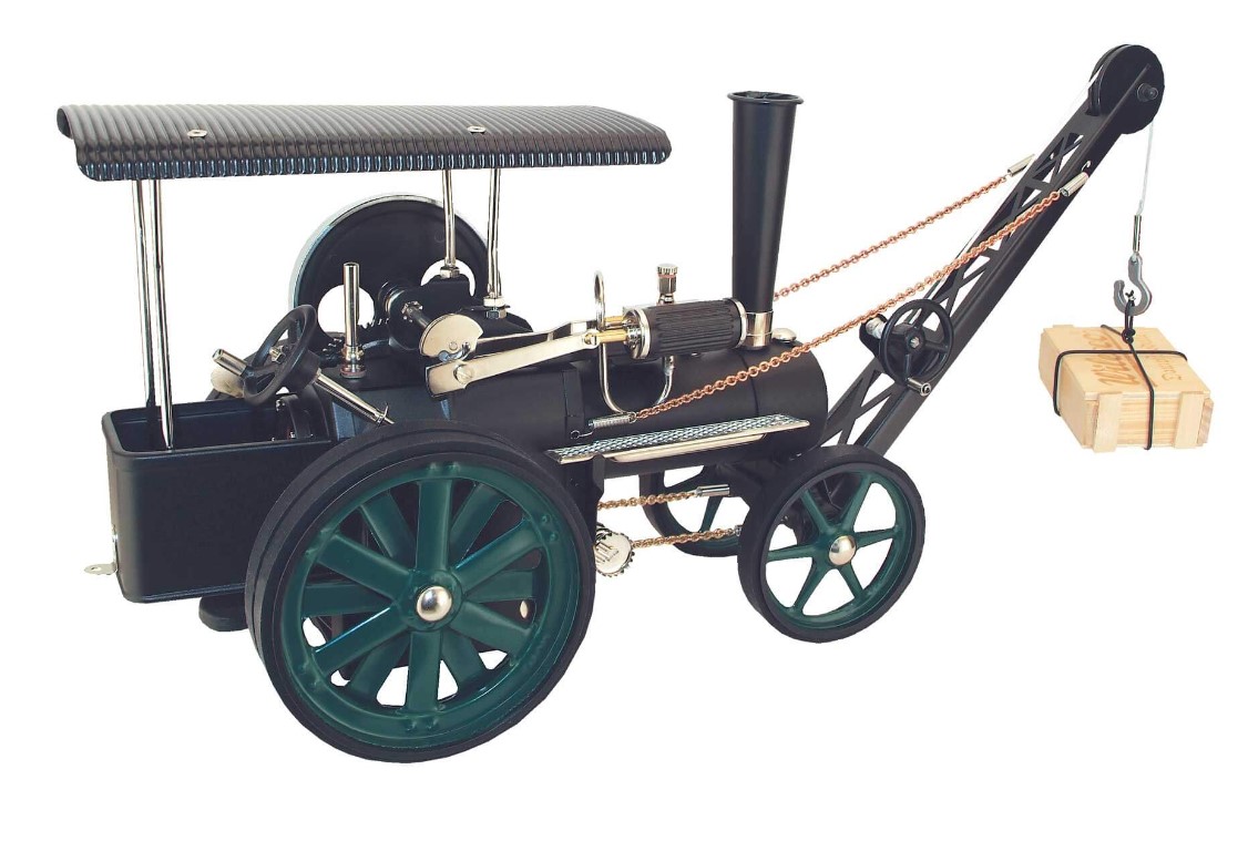 Das kurze Dach, die besondere Lackierung und weitere Verzierungen erinnern an die historischen Vorbilder dieser dampfbetriebenen Traktoren. Dazu zählt auch die Bereifung, die ebenfalls bei den großen Brüdern vorhanden war. Der Kran lässt sich durch die Lenkung steuern und durch ein Handrad mit Winde manuell heben und senken.