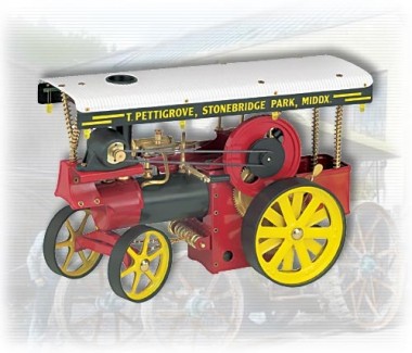 Ein voll funktionsfähiges Dampfmodell aus der Serie WILESCO-Hobby-Technik. Technisch ausgereift und farblich dekorativ gestaltet. Ein chemisch schwarz gefärbter Messingkessel, Durchmesser 45 mm, Länge 185 mm, Kesselvolumen 230 cm³, mit einem als Schauglas ausgebildeten Wasserstandsanzeiger. Ein leistungsstarker, doppelt wirkender feststehender Messingzylinder mit einem in beide Drehrichtungen anwerfbaren Schwungrad mit einem Durchmesser von 80 mm. Der Dampftraktor fährt daher vor- und rückwärts. Mit Federsicherheitsventil, Dampfabsperrventil, Dampfpfeife, Dampfstrahlöler, Laufsteg am Kessel, Steuerrad mit Kettenlenkung. Ein auskuppelbares Zahnradgetriebe sorgt dafür, dass sowohl während der Fahrt als auch im stationären Betrieb über die große Antriebsachse der aufmontierte Dynamo die acht unter der Dachleiste befestigten Leuchtdioden aufscheinen lässt. Der Abdampf wird in ein Sammelbecken im vorderen Teil des Kessels geleitet, dadurch dampft der Kamin während des Betriebes. Laufzeit ca. 15 Minuten. Das Modell wird mit Trockenbrennstofftabletten beheizt. Alle Einzelteile aus Metall, teilweise lackiert oder mit veredelter Oberfläche.