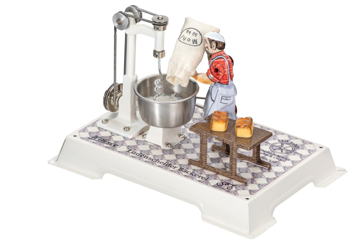 Die beliebte Wilesco Handwerkerserie wird um das Backhandwerk erweitert. Wir präsentieren den fleißigen Bäcker in seiner Backstube, der die Knetmaschine unermüdlich befüllt, um den Brotteig zu kneten. Die Sonderedition zum 110-jährigen Firmenjubiläum ist nun vergriffen, aber keine Sorge! Sie können nun die reguläre Version des Modells in einer anderen Farbvariante erwerben.