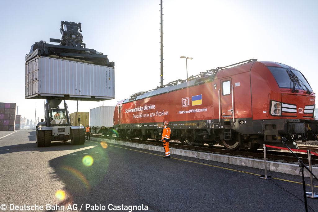 Die Deutsche Bahn hat ein Logistiknetzwerk aufgebaut, um Hilfsgüter von Deutschland direkt in die Ukraine zu befördern. Dabei arbeiten die Logistikteams von DB Cargo, DB Schenker und der DB Transa-Spedition Hand in Hand. Über die DB-Schienenbrücke gelangen per Güterzug dringend benötigte Güter wie Lebensmittel, Trinkwasser, warme Kleidung, Sanitärartikel und medizinische Produkte direkt in das Land. Die Spenden werden in Deutschland per Lkw gesammelt, in Container verpackt und schließlich per Güterzug im europäischen Bahnnetzwerk von DB Cargo über die Grenze in die Ukraine gefahren. Seit der Errichtung der Schienenbrücke konnten bereits 25 Züge erfolgreich die Brücke nutzen.